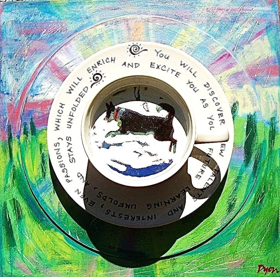 Cups of Rosie is a series of nine constructions depicting a border collie in various states of movement set against a snowy background. Written around the saucers are short texts which give positive life predictions evoked by the emotional impact conveyed by the dog, Rosie, in the cups (of tea). Hence, the “Cups of Rosie”.